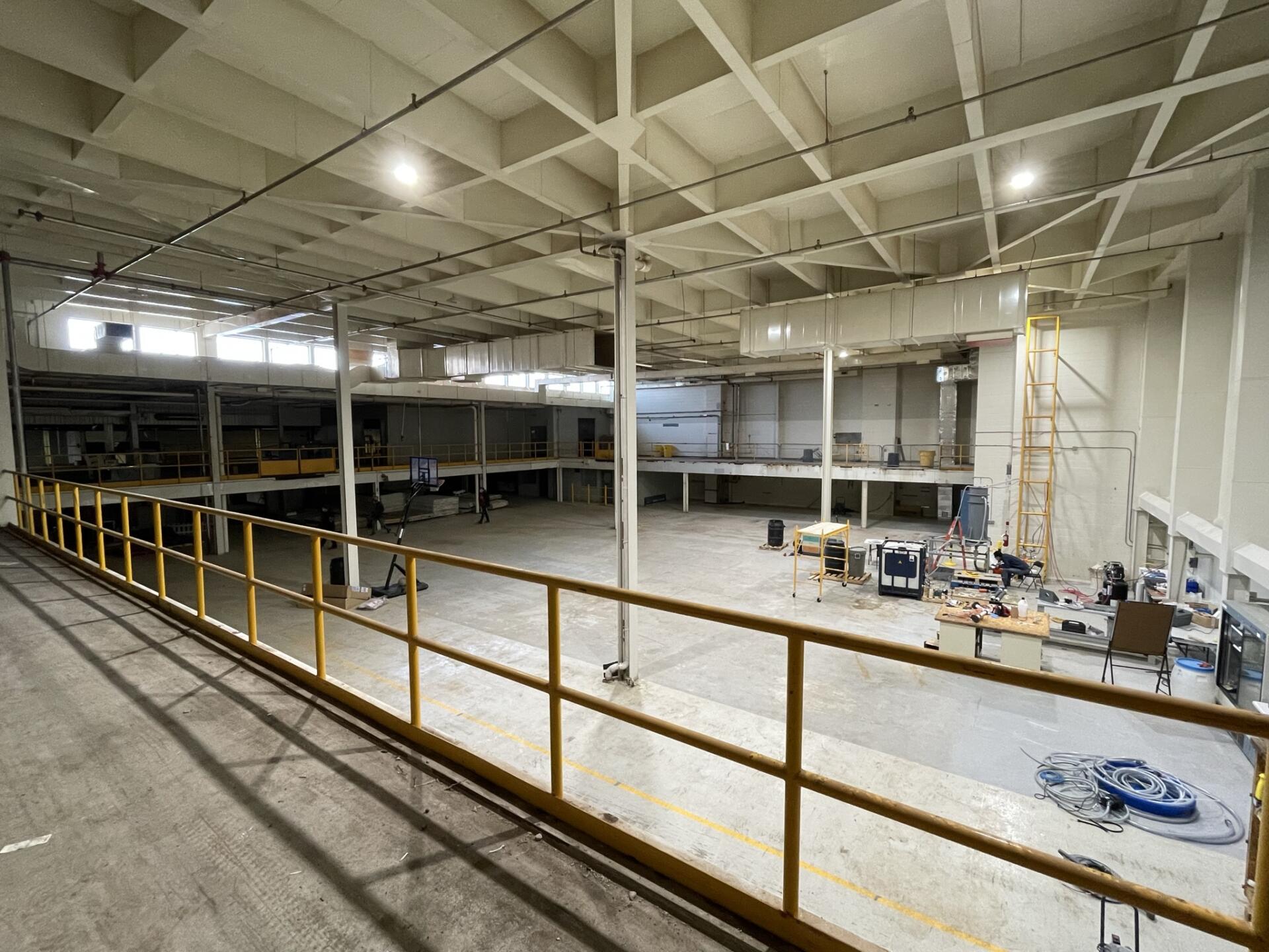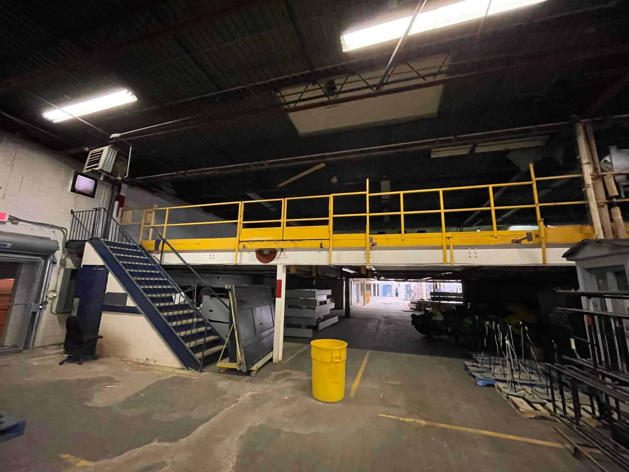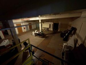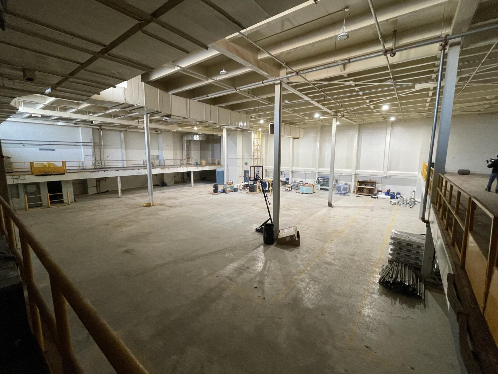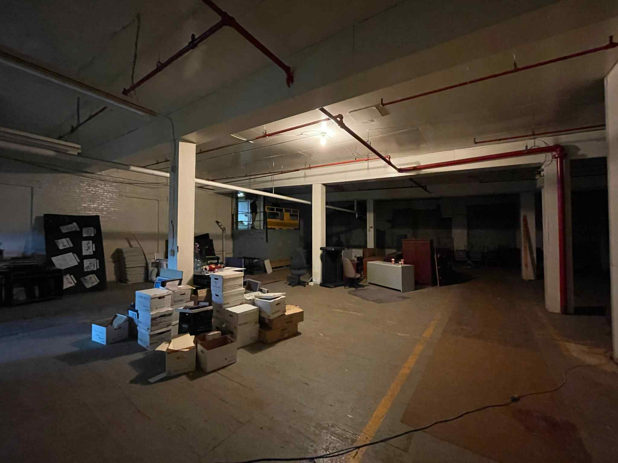 Large, formerly industrial space. Serviced with water and full power. Has freight elevator and second level around exterior. Works well as space for a small set or soundstage.