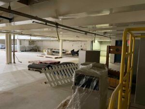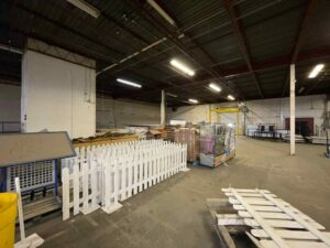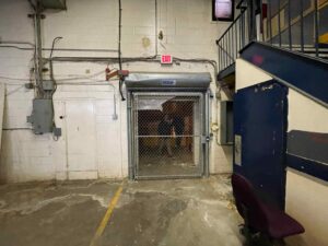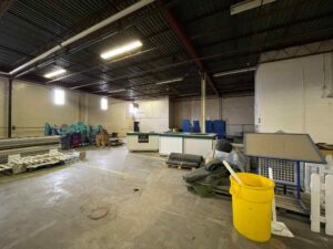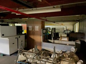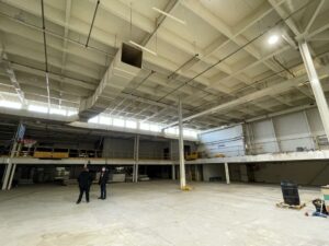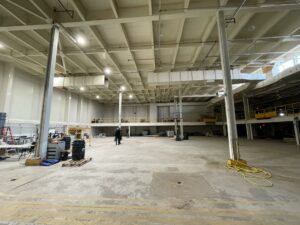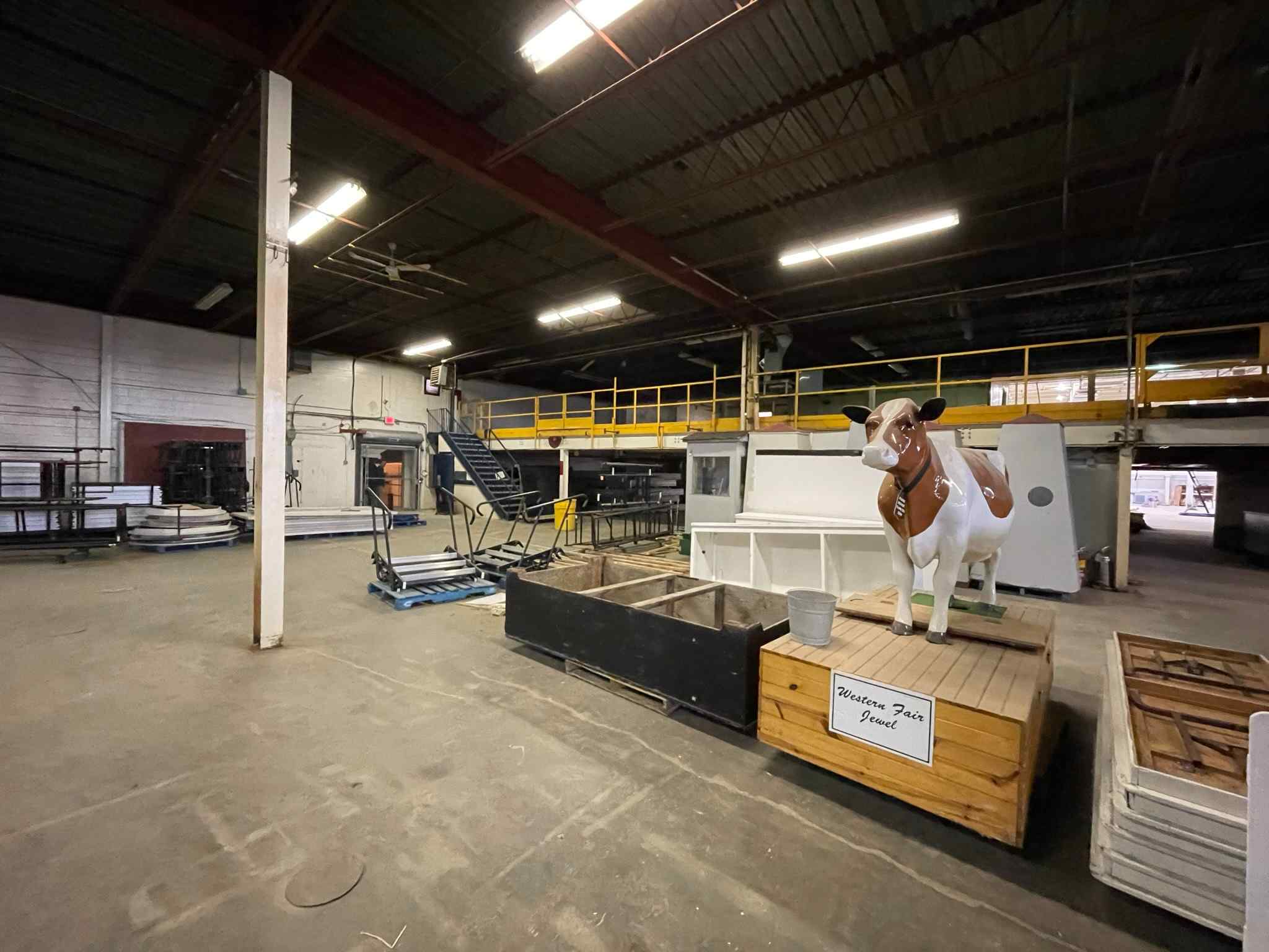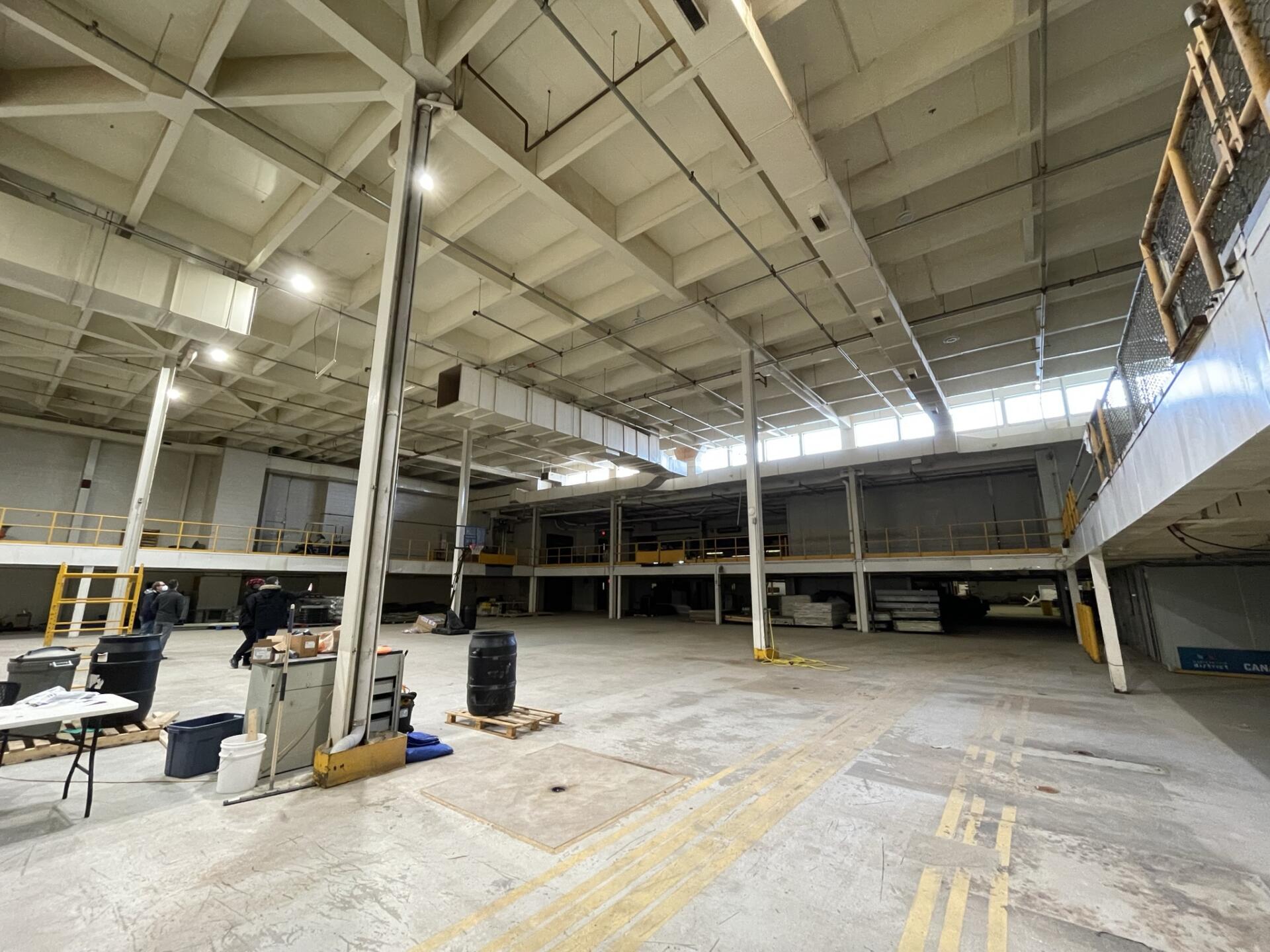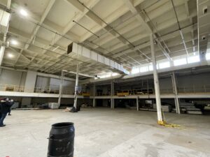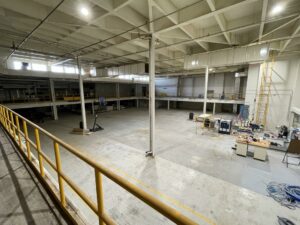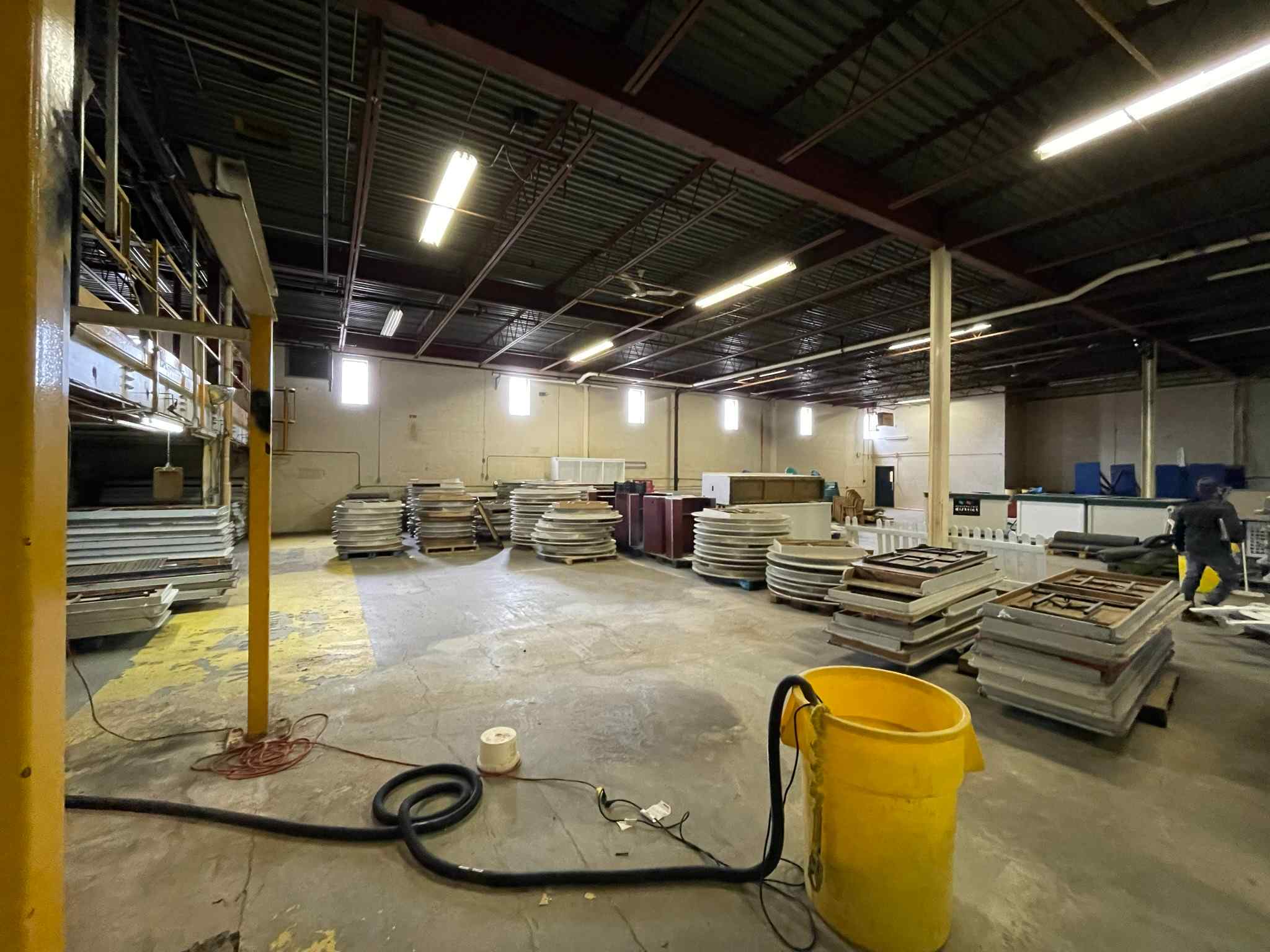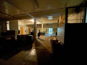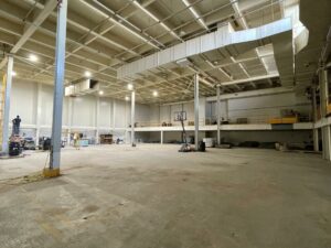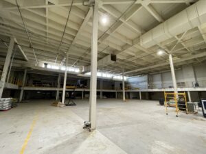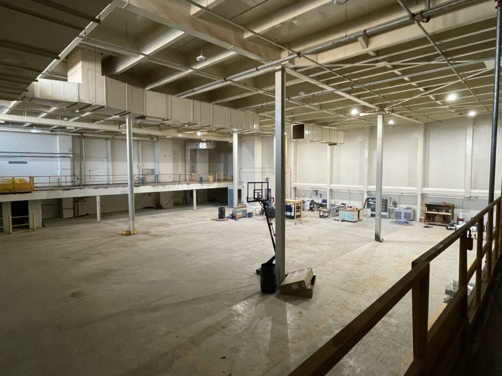 Large, formerly industrial space. Serviced with water and full power. Has freight elevator and second level around exterior. Works well as space for a small set or soundstage.